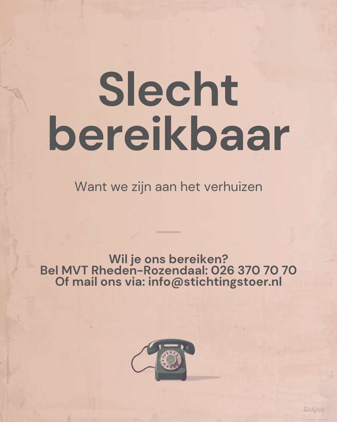 Door de verhuizing van STOER zijn we op dit moment telefonisch niet bereikbaar op ons eigen nummer. Je kunt het nummer van STOER wél gewoon bellen, maar je krijgt dan iemand van MVT Rheden-Rozendaal aan de lijn. Je kunt ook direct naar MVT bellen op nummer: 026 3707070.